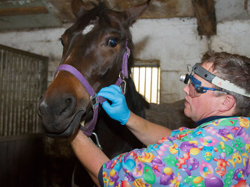 Zur Wolfszahnextraktion müssen diverse Voruntersuchungen durchgeführt werden: das Kiefergelenk des Pferdes wird abgetastet und eine erste Diagnose wird zur Begründung der Zahnbehandlung erstellt. Wichtig auch